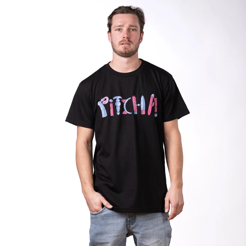 Pitcha TOYS t-shirt - a logo that vibrates with style. Here the imagination really had no limits. Our classic logo, but composed of vibrators and other adult pleasures. So yeah - at first glance the design, at second glance "aha... of course!". A little spicy. Very original. 100% Pitcha.